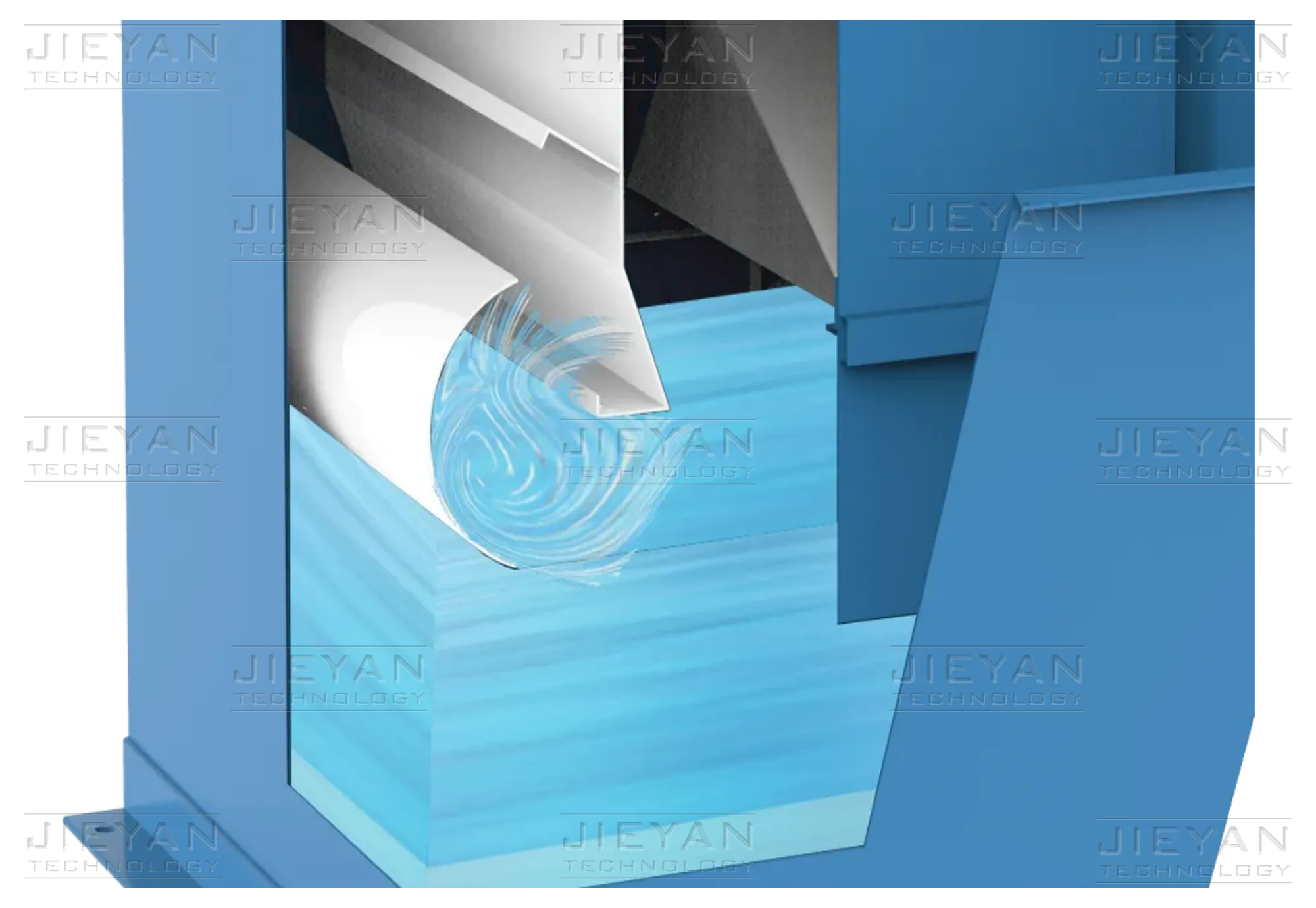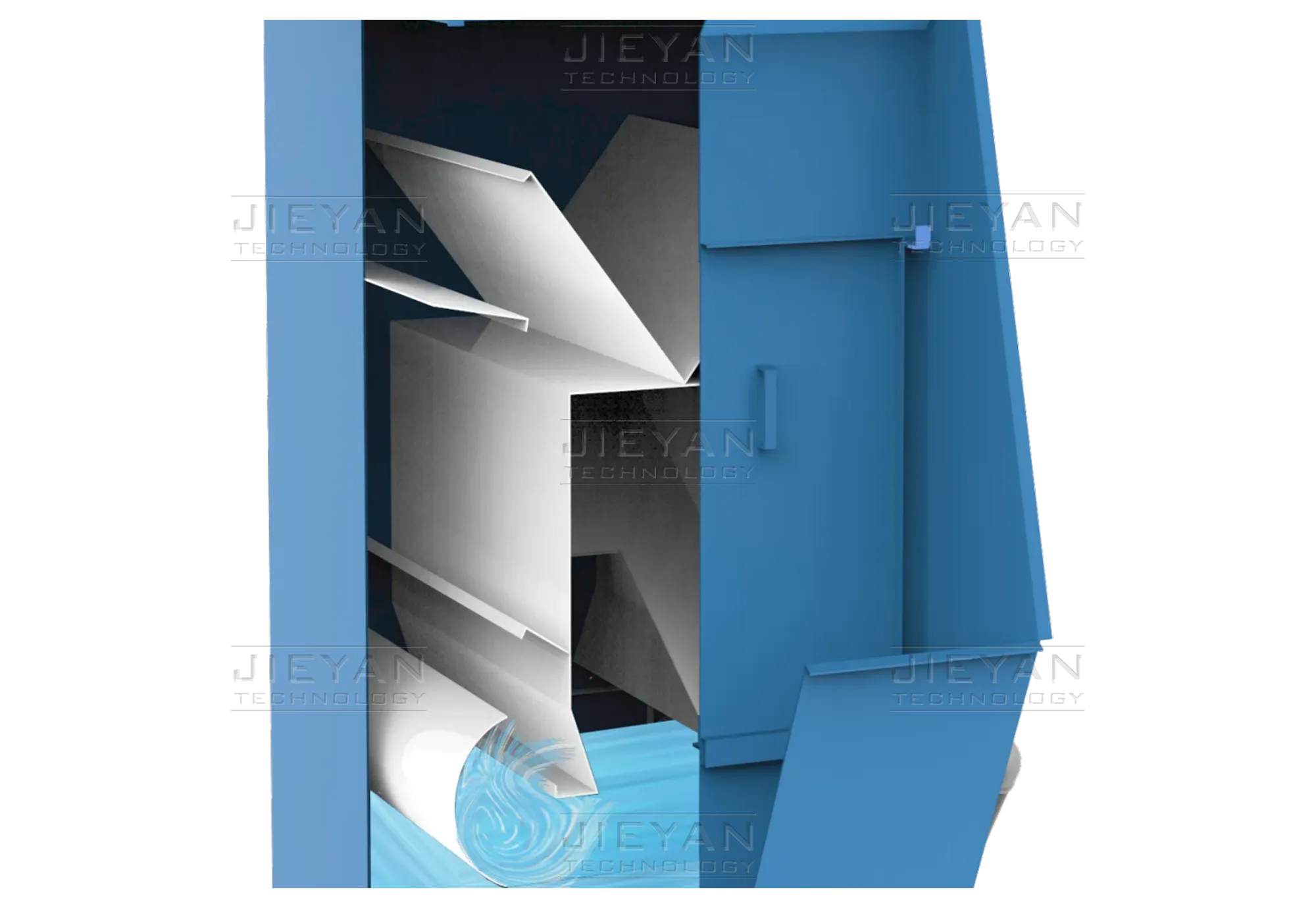 With an oversized tank and demisting velocity below 1.5 m/s, the system achieves enhanced mist elimination. Three specially curved baffles provide effective moisture separation with low pressure drop, while the complete absence of mesh elements eliminates any clogging risks.