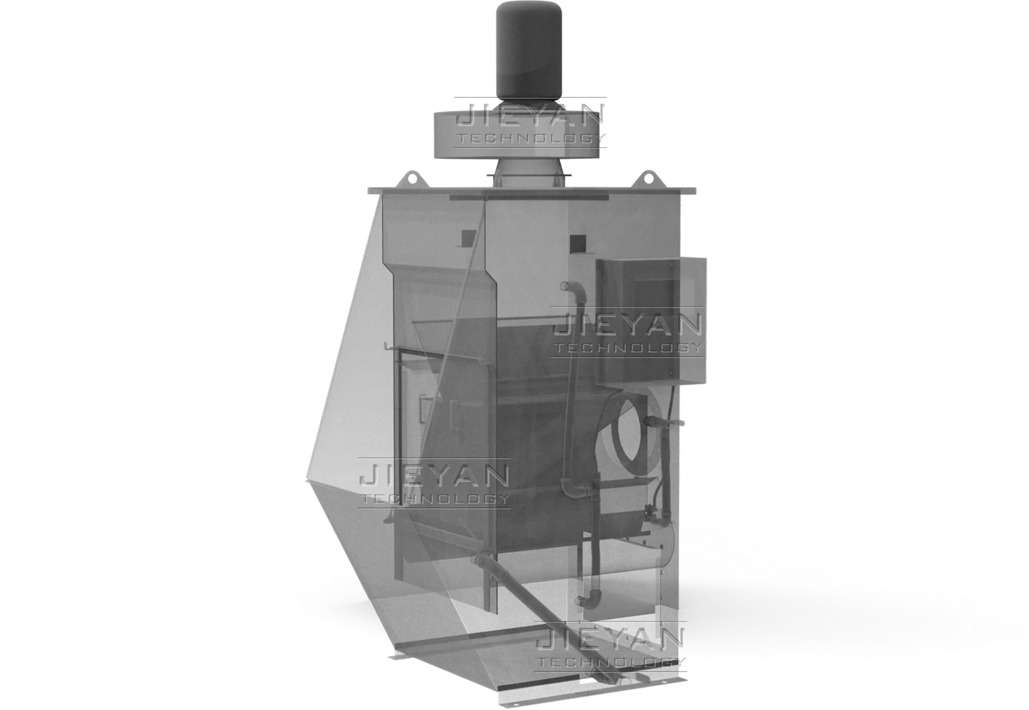 Based on the proven N-Type design, the Model LV operates on a principle that combines centrifugal force with intense water-and-air scrubbing. Dust-laden air passes a stationary impeller, creating a high-velocity airflow that carries water into a turbulent curtain. Rapid changes in airflow direction generate centrifugal force, driving dust particles to penetrate and become permanently entrapped within the water droplets. The dust-laden droplets are then removed from the airstream by a water eliminator. The dust settles in the collector sump, and the water is recirculated—requiring no pumps or nozzles. With its compact design that integrates the fan, scrubbing chamber, water level control, and drain, the unit can be installed close to the dust source or connected via ductwork. This provides a safe and reliable wet collection method for low-volume, high-risk dust control applications.