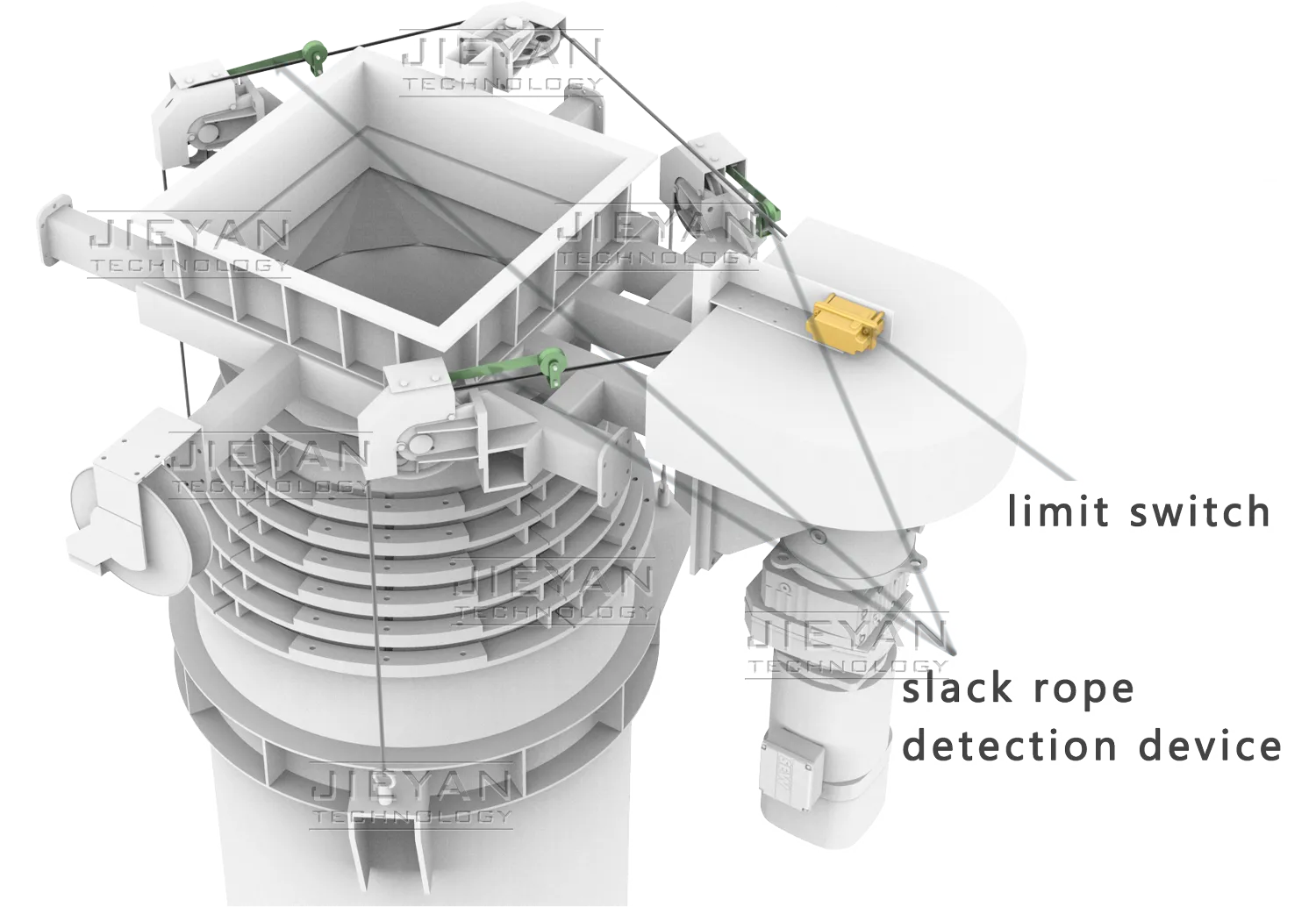 Programmable limit switches with backup settings and standard slack rope detection prevent overtravel and derailment for failsafe operation.