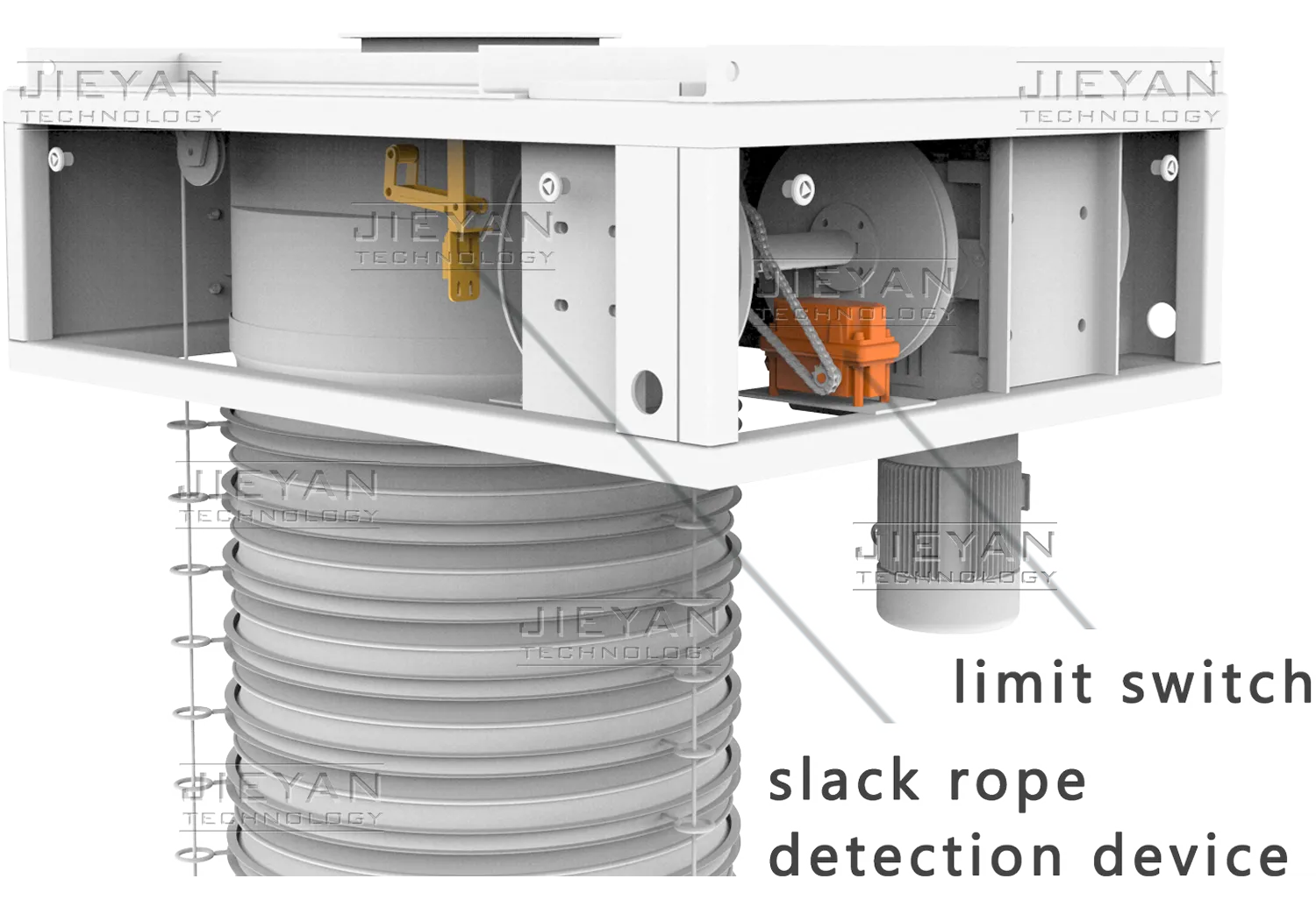 Adjustable limit switches with spare settings and standard slack rope detection prevent over-travel and derailment, ensuring safe operation in all conditions.
