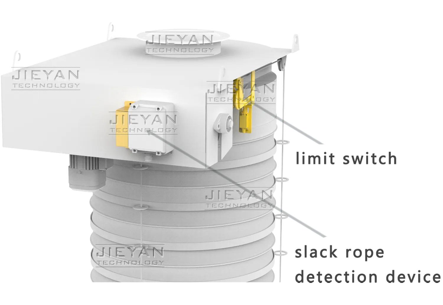 Fully adjustable limit switches with spare settings and standard slack rope detection prevent overtravel and derailment, ensuring operational safety and equipment protection.